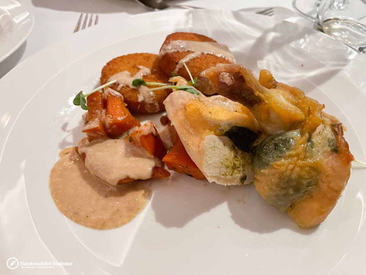 Zur Vorspeise gab es bei uns ein Räucherfischmousse und danach eine Kürbiscremesuppe. War beides geschmacklich sehr gut, wobei mir persönlich die Suppe etwas zu salzig war. Zur Hauptspeise wurde eine gefüllte Maispourladenbrust serviert. Auch hier wieder geschmacklich einwandfrei, wobei das Fleisch etwas saftiger hätte sein können. Zum Abschluss gab es ein Mandel-Apfel-Tiramisu - sehr lecker. Gute zwei Stunden hat das Abendessen in Anspruch genommen, für mich eine perfekte Dauer.
