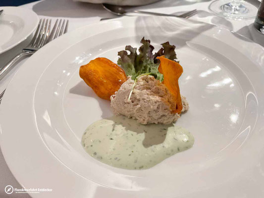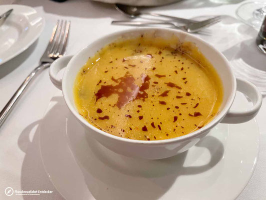 Nachdem es am gestrigen Abend etwas ruhiger zuging und die Falstaff-Redakteurin ihre Schaumweine vorgestellt hat, stand heute die große Willkommens-Gala an. Dazu haben sich der Kreuzfahrtleiter, der Kapitän sowie der Hotel Manager in der Lounge eingefunden. Auch einige Vertreter der jeweiligen Departments wie Housekeeping oder Restaurant waren dabei. Nach einem Gläschen Sekt ging es runter ins Hauptrestaurant zum sechsgängigen Abendmenü: