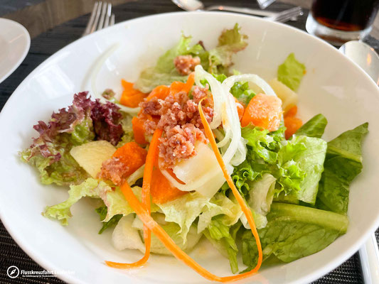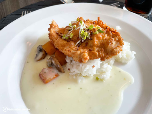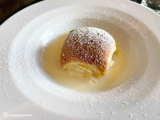 Pünktlich zum Mittagessen waren wir nun wieder zurück an Bord. Zur Vorspeise gab es einen Feldsalat und anschließend eine Käse Cremesuppe. Als Hauptspeise wurde ein Hühnerfrikassee serviert - in einer sehr interessanten Interpretation. Durch einen Fehler bei der Kommunikation in der Küche, wurde das Hähnchen paniert. War aber trotzdem sehr lecker! Als Dessert gab es dann eine leckere Buchtel.