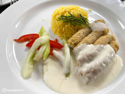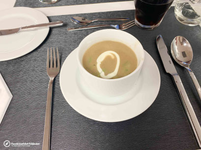 Vor dem Restaurant haben uns der Kapitän, der Hotel Manager sowie unsere Kreuzfahrtleiterin mit einem Glas Sekt empfangen, wonach es weiter zu unserem Tisch ging. Das Menü besteht immer aus vier Gängen: Zur Vorspeise hatte ich einen Salat mit gebratenem Lachs und anschließende eine leckere Cremesuppe. Als Hauptgang dann ein Fischfilet und zur Nachspeise eine Art Apfelkuchen.