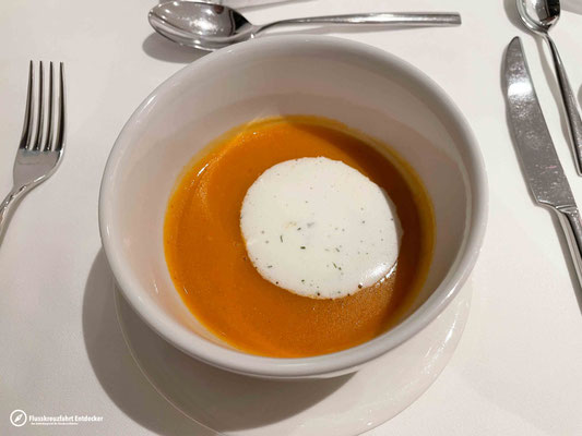 Für unseren Erkundungstag in Amsterdam, mussten wir uns natürlich erstmal stärken. Das ging im Restaurant ganz gut. Aus der Frühstückskarte konnte man sich einige leckere Speisen aussuchen. Tatsächlich gab es an Bord der MS Annika weiterhin noch kein Frühstücksbuffet, so wie es auch schon im Juli auf der MS Anna Katharina war, die ebenfalls für Phoenix Reisen unterwegs ist. Bei anderen Veranstaltern und Reedereien gibt es teilweise bereits wieder ein Frühstücksbuffet. Für die Leute, bei denen es gestern später wurde und die noch etwas schlafen wollten, gab es um elf Uhr eine heiße Bouillon in der Lounge.