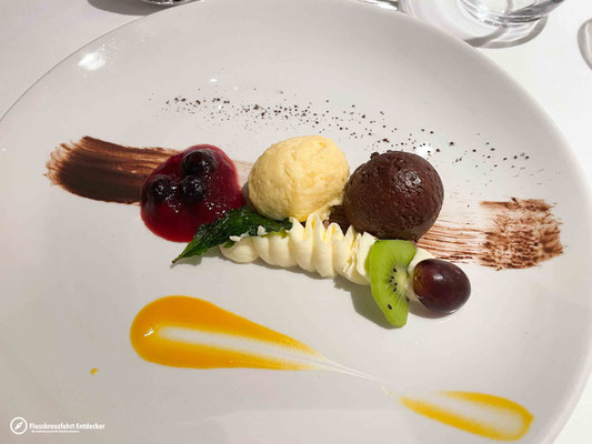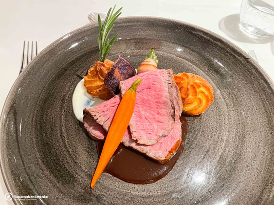 Zur Vorspeise hatte ich ein leckeres Rindercarpaccio, danach eine Hummerschaumsuppe. Zur Erfrischung gab es anschließend ein Himbeersorbet. Als Hauptgang gab es für mich ein Roastbeef und als Dessert schließlich ein ,,Schwarz-Weiß-Schokoladenmousse’’. Ein wirklich sehr gelungenes Abendessen.