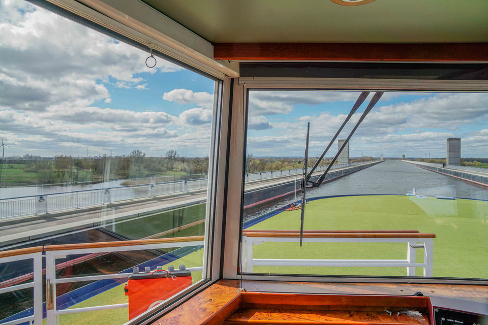 Die Elbe mit dem Schiff passieren, ohne das Elbwasser zu berühren? Das geht! Wir haben mit der MS Thurgau Chopin das Wasserstraßenkreuz bei Magdeburg erreicht, wo genau das passiert. Nachdem wir die Schleuse Hohenwarthe passiert haben, überfahren wir die Kanalbrücke Magdeburg, die den Mittellandkanal führt. Sie verläuft praktisch parallel zur Elbebrücke Hohenwarthe, die Teil der Autobahn A2 ist. Beobachten durften wir das Spektakel bei Kapitän Frank Baehring im Steuerhaus, was das Ganze natürlich nochmal ein ganzes Stück spannender machte. Unser heutiger Übernachtungshafen ist Wolfsburg, wo wir direkt gegenüber der Autostadt festmachen. Schade, dass es hier kein längeren Aufenthalt gibt. Dafür hat man natürlich einen Grund, nochmal wiederzukommen.