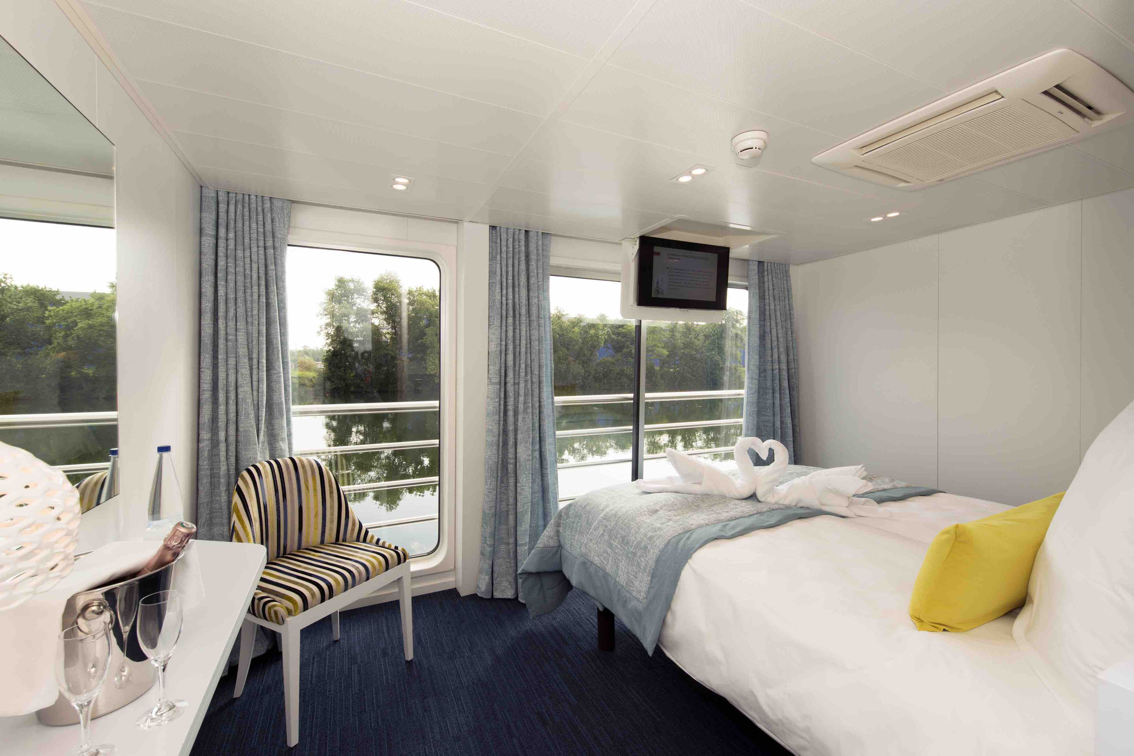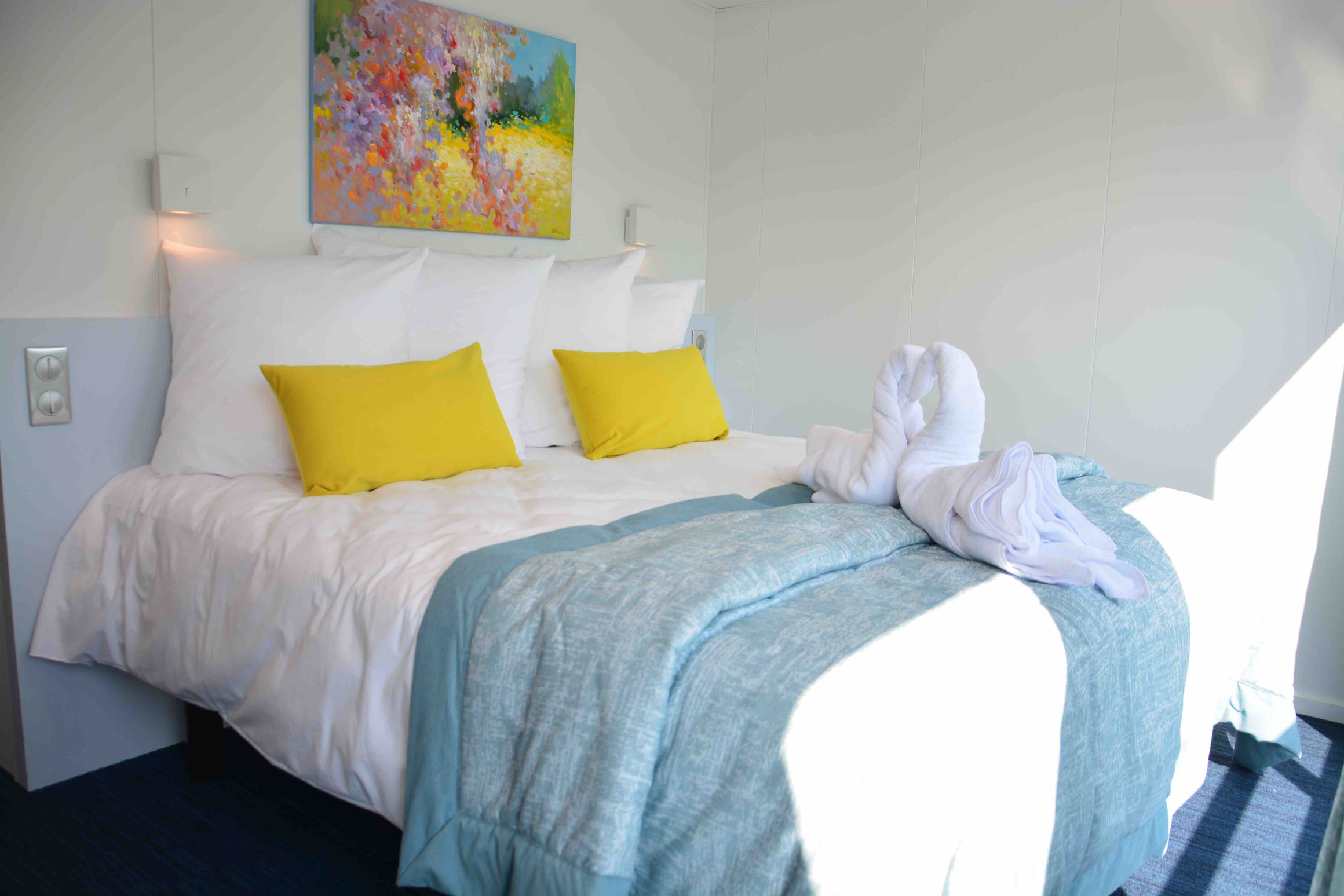 Auf der MS Douce France gibt es im Grunde genommen nur zwei Kabinenkategorien. Die Kabinen unterscheiden sich nicht in der Ausstattung, sondern eher in der Lage. An Bord stehen mehrere Suiten auf dem Haupt- und Oberdeck zur Buchung frei.